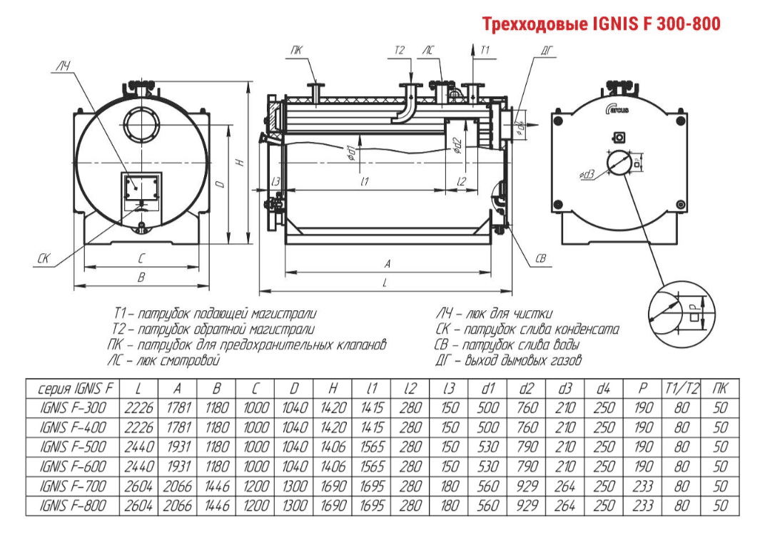 Технические характеристики водогрейного трёхходового котла ARCUS IGNIS F-400